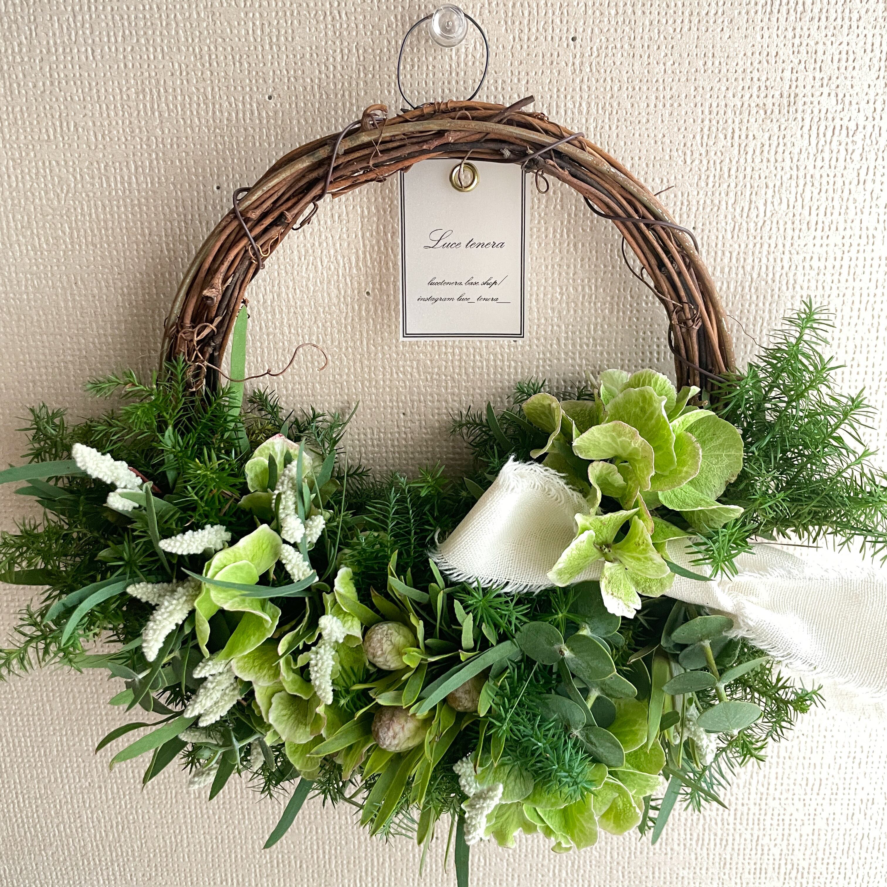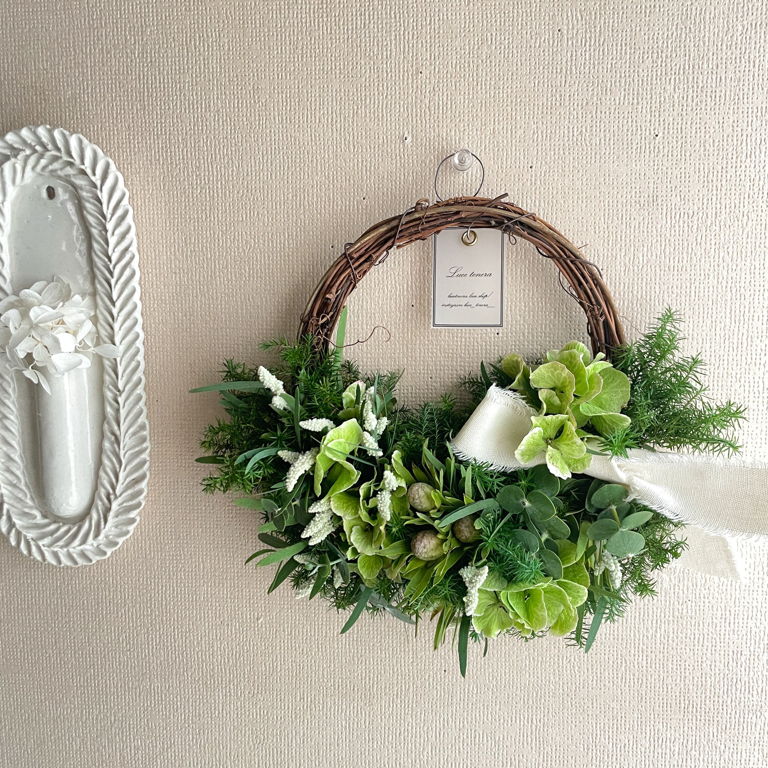 グリーンとホワイトを基調に、柔らかな光を感じるように仕上げたナチュラルリース。