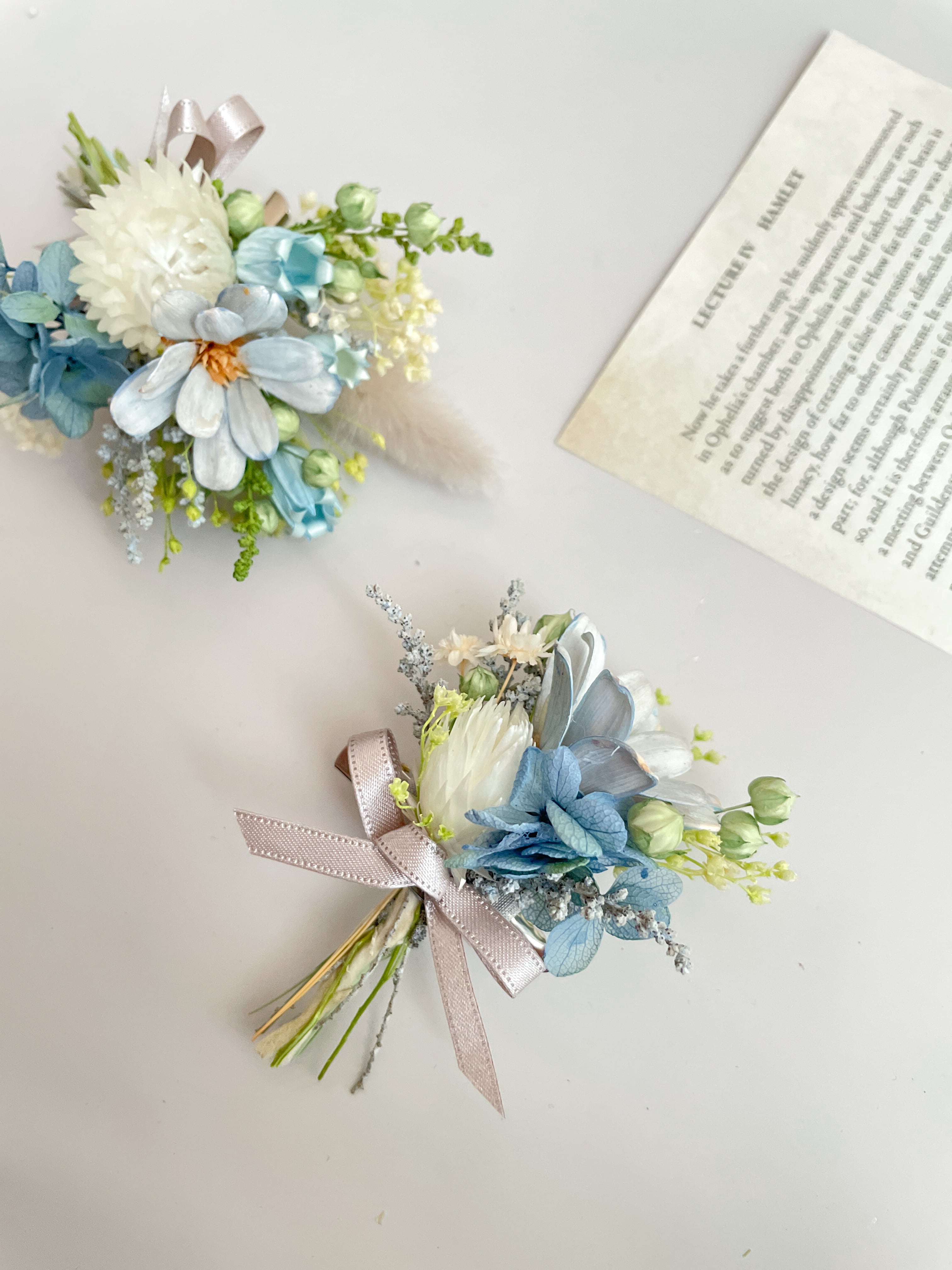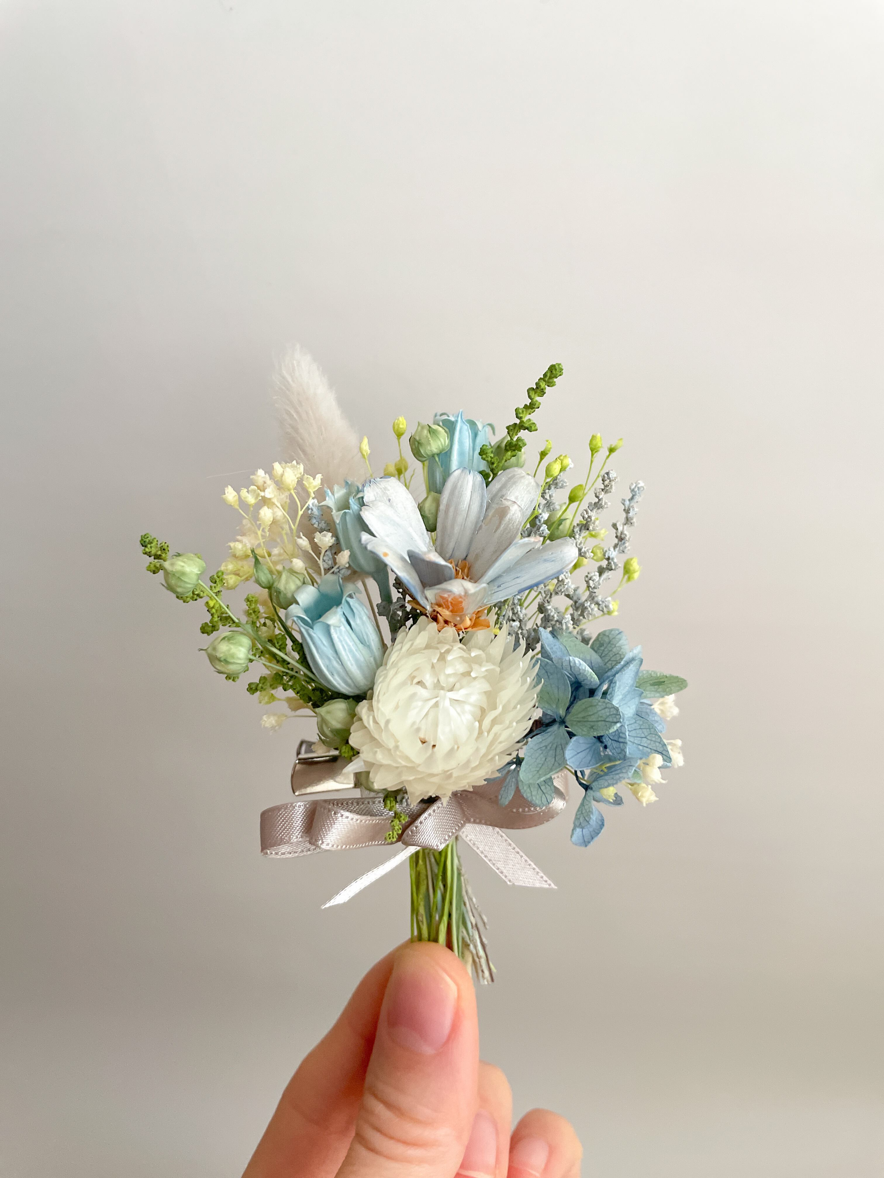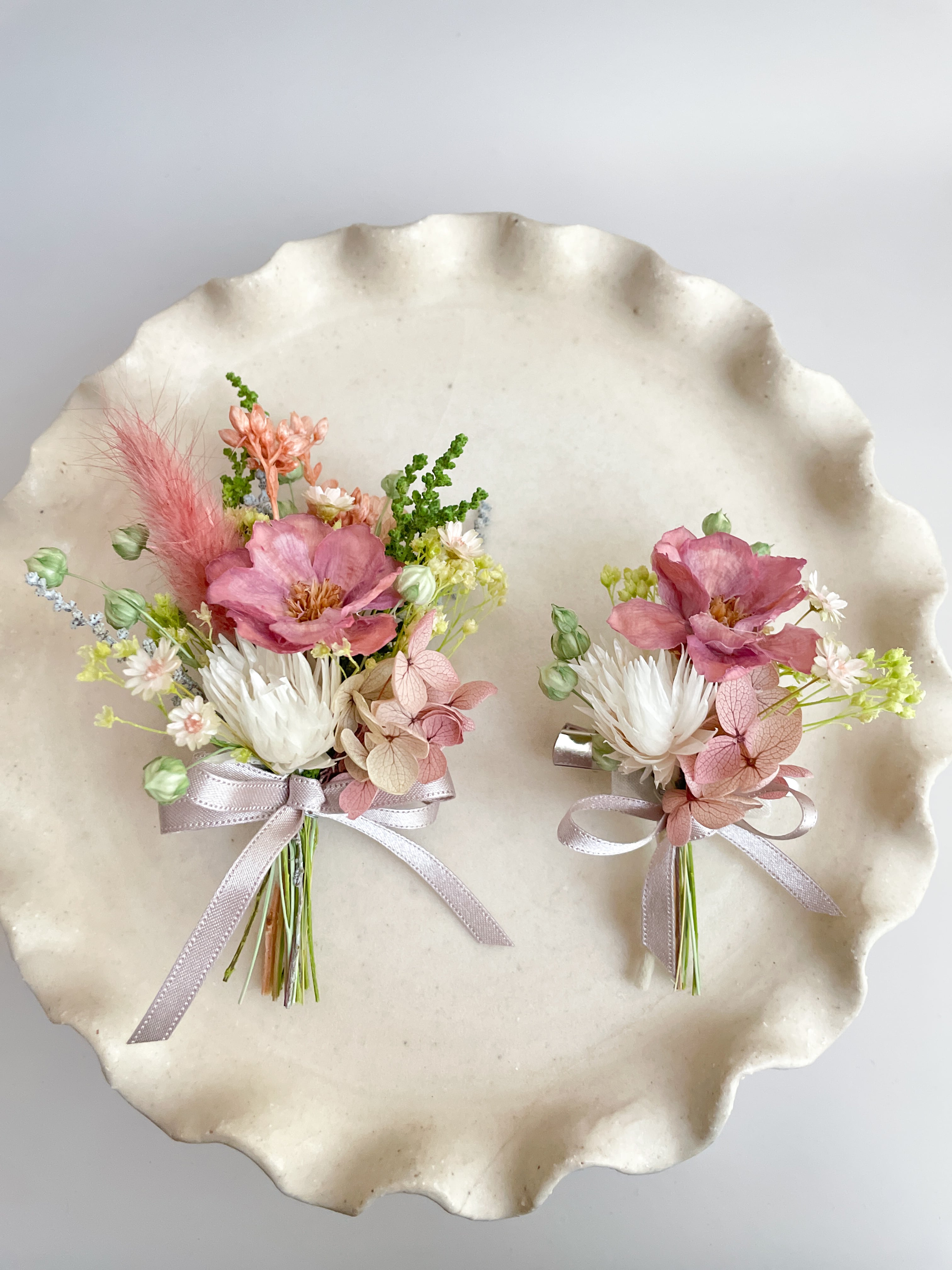 お父様用コサージュのお色味変更(お母様ピンク、お父様ブルー)なども承っております。