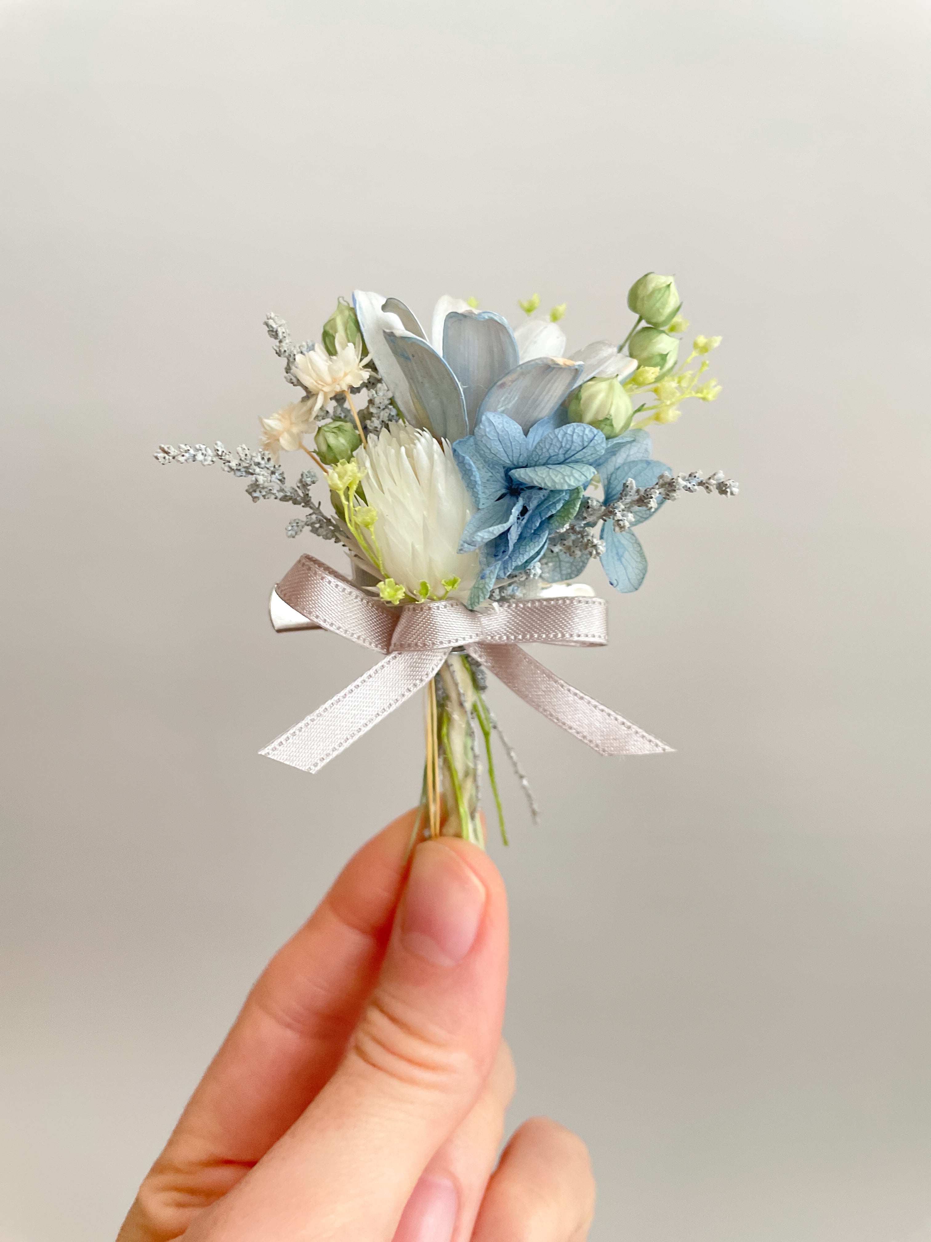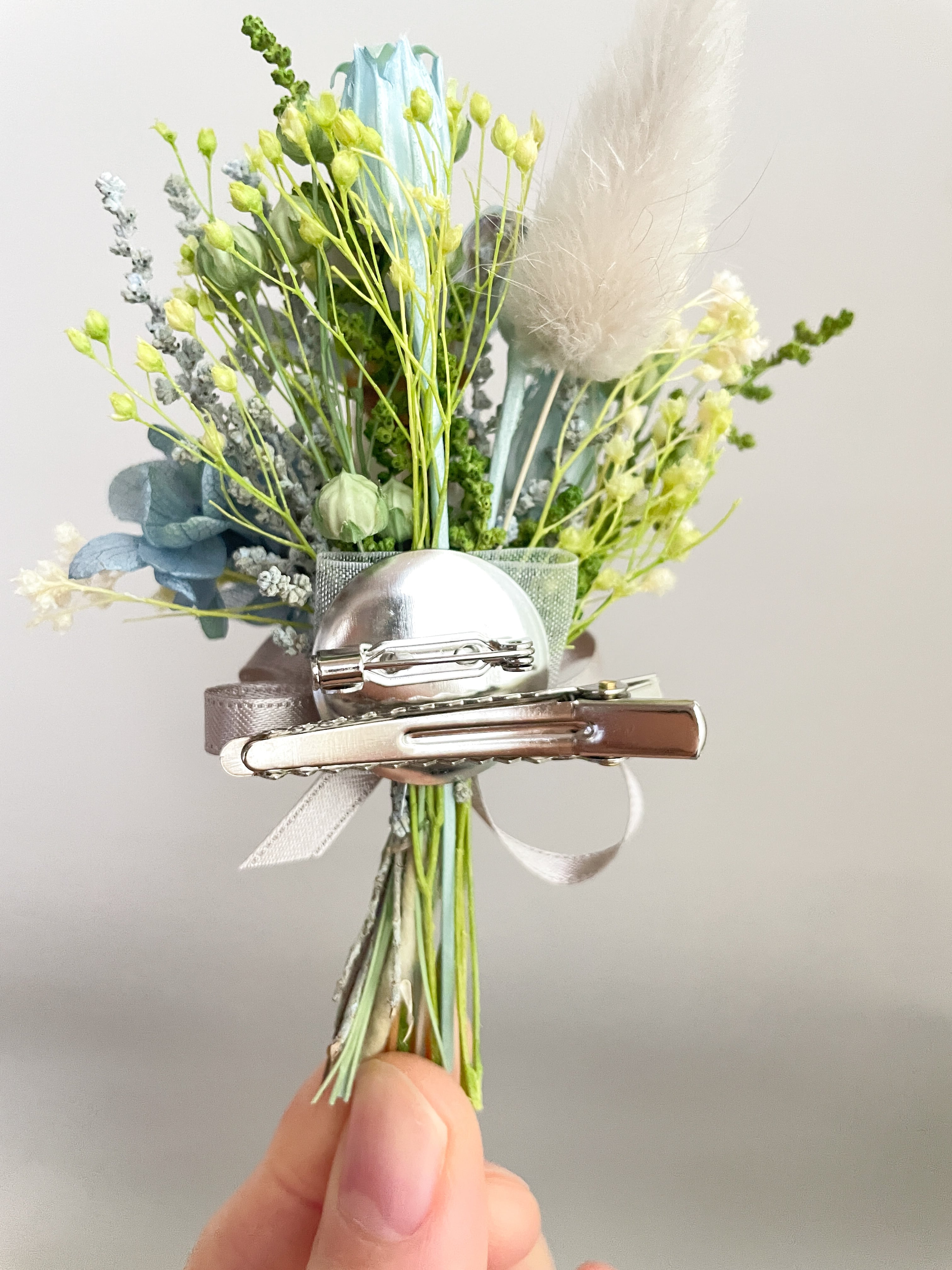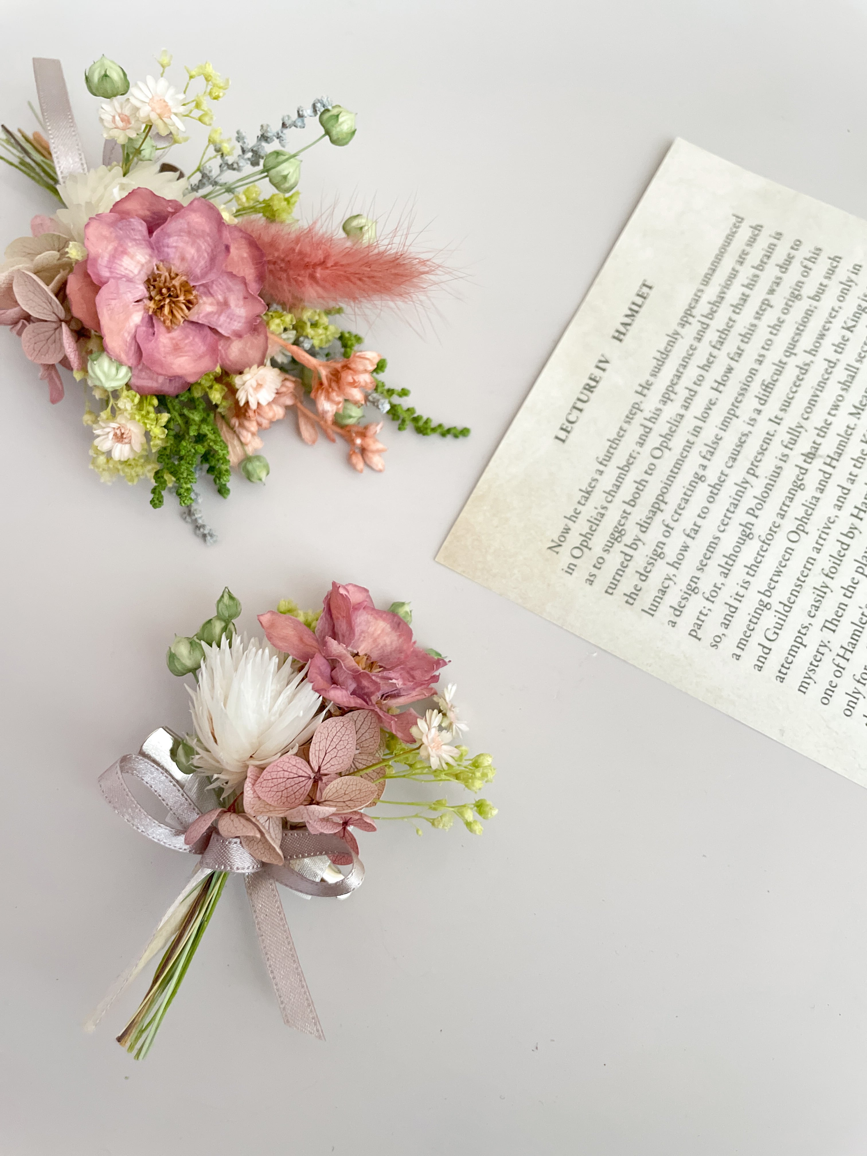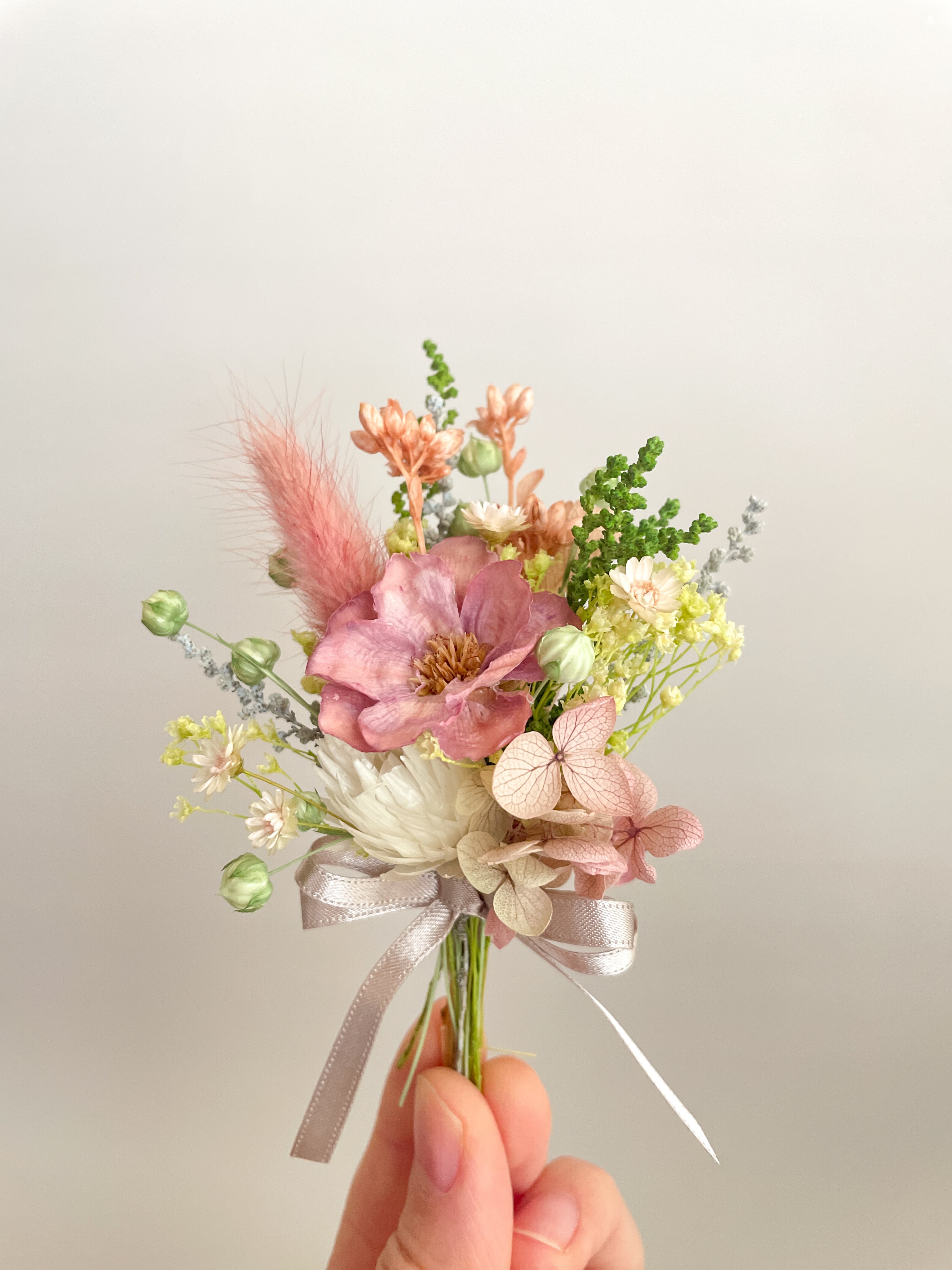 小さな花束をそのまま胸につけるようなイメージで、 ナチュラルでやさしい雰囲気に仕上げました。