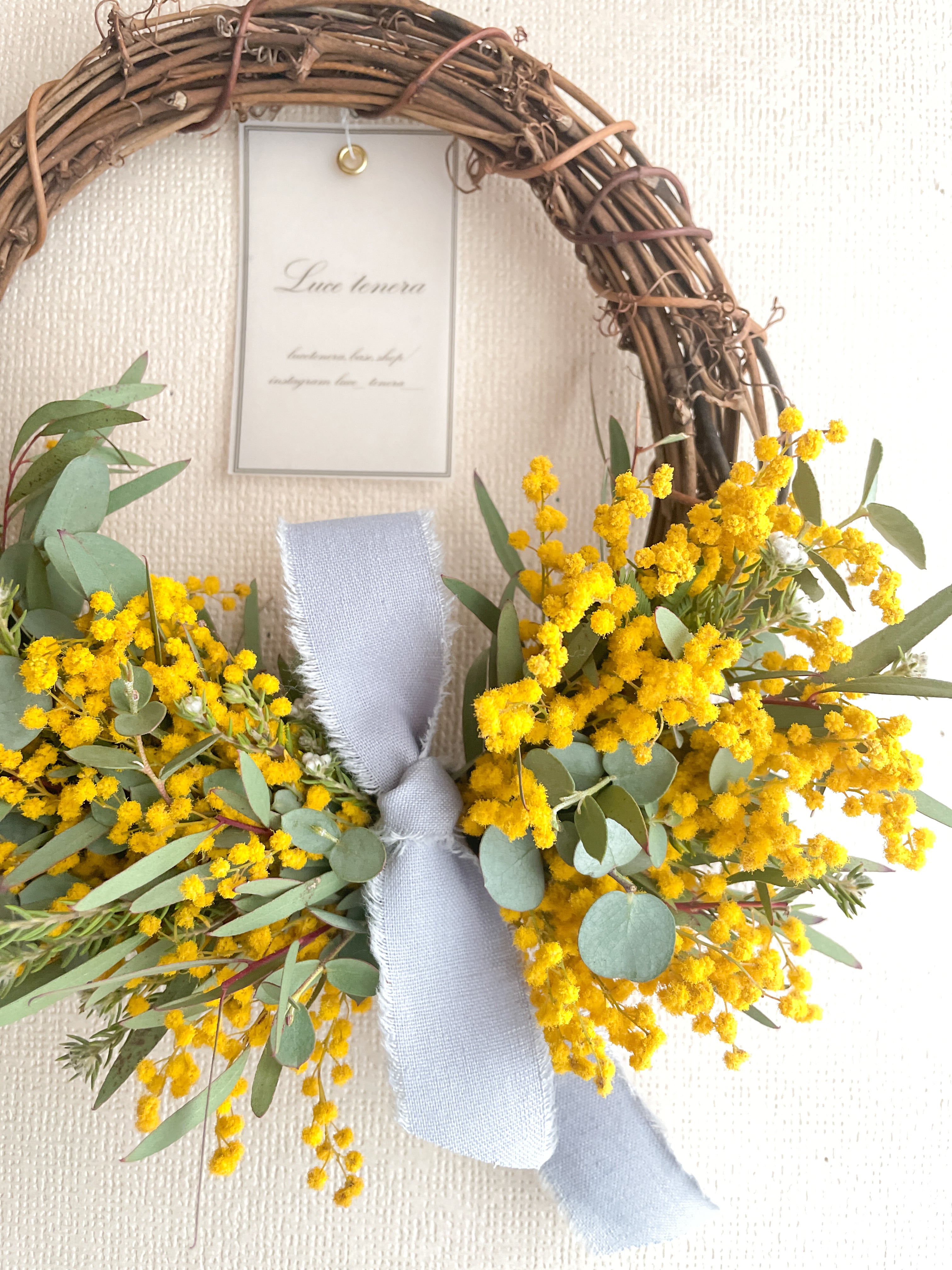 ※ミモザは制作〜数ヶ月ほどで黄色から落ち着いた山吹、オレンジのよう色合いになっていきます。