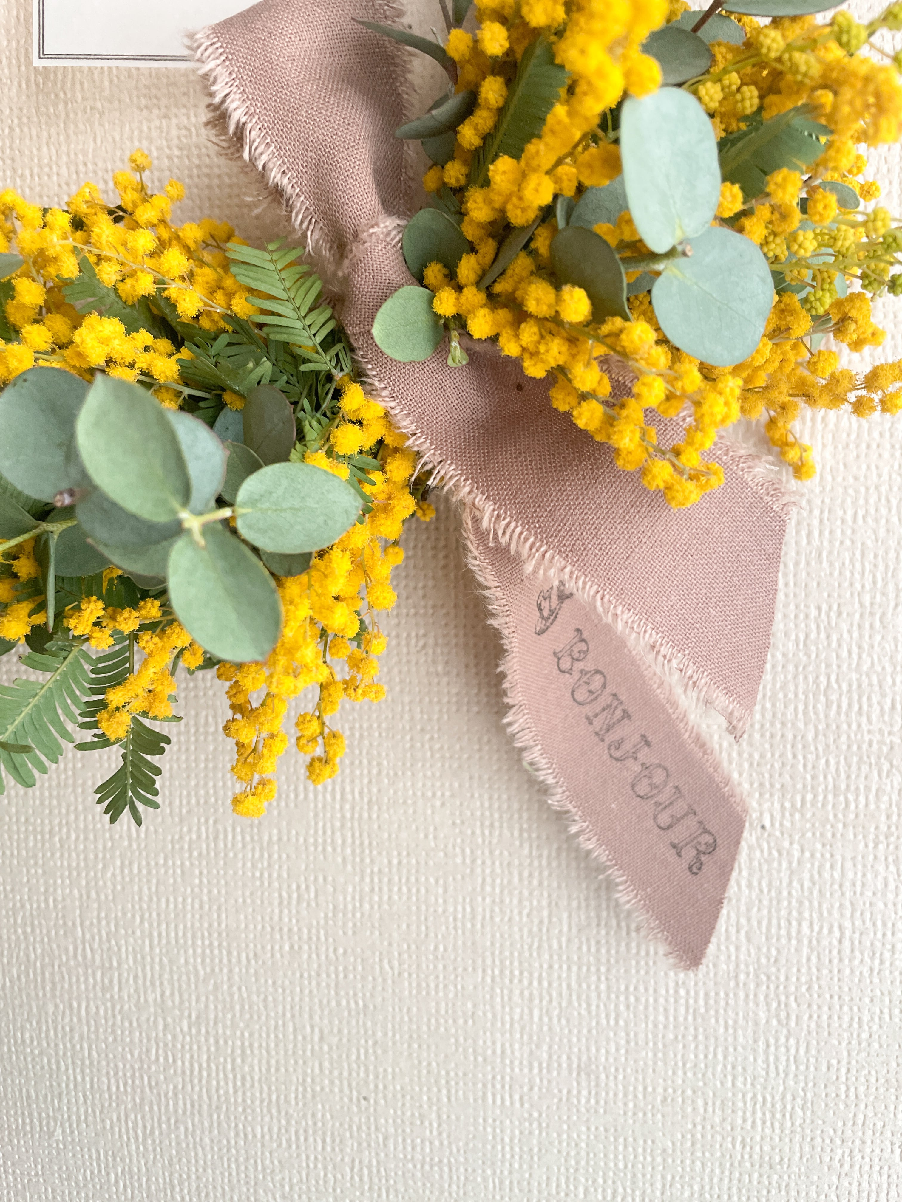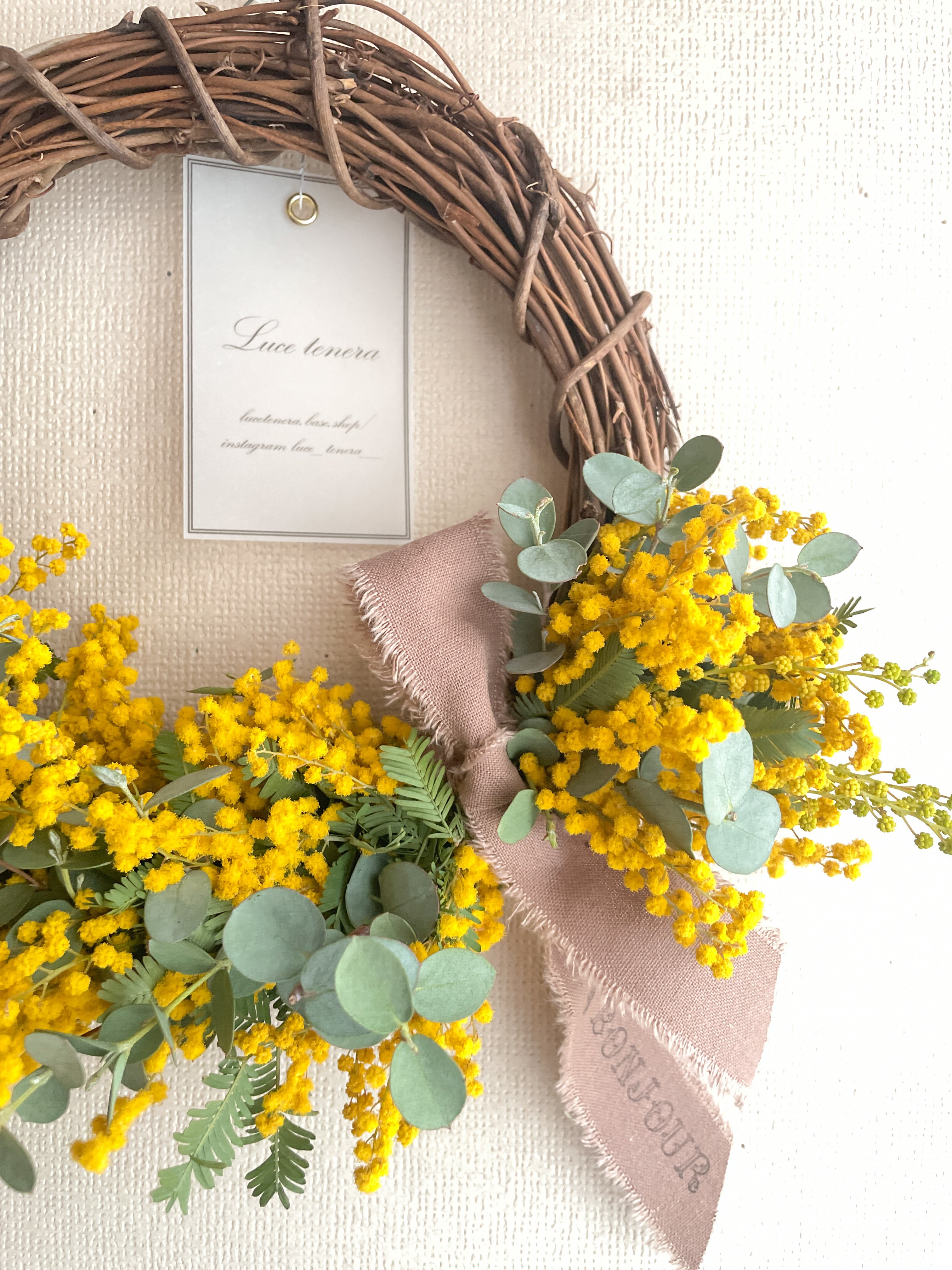 ※ミモザは制作〜数ヶ月ほどで黄色から落ち着いた山吹、オレンジのよう色合いになっていきます。