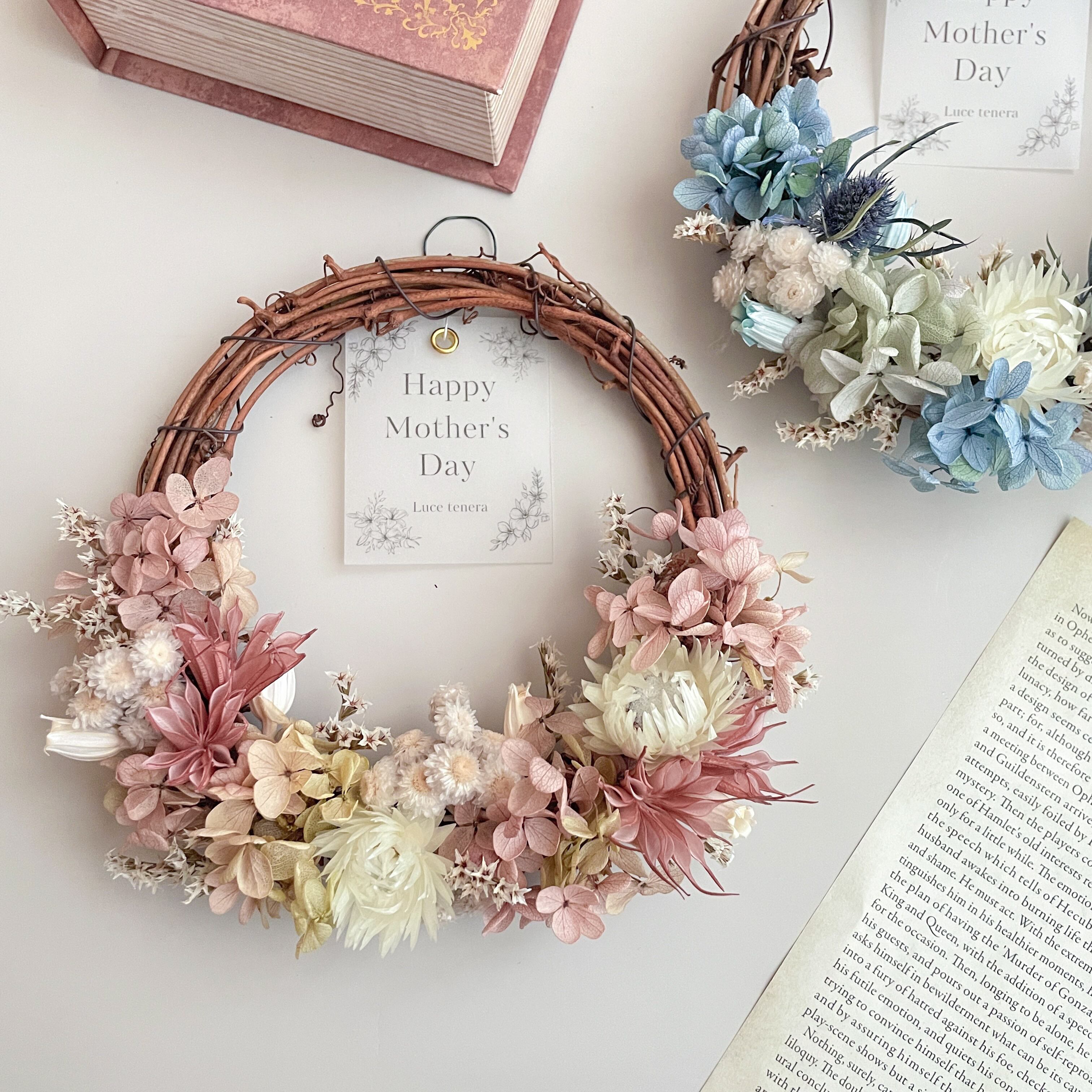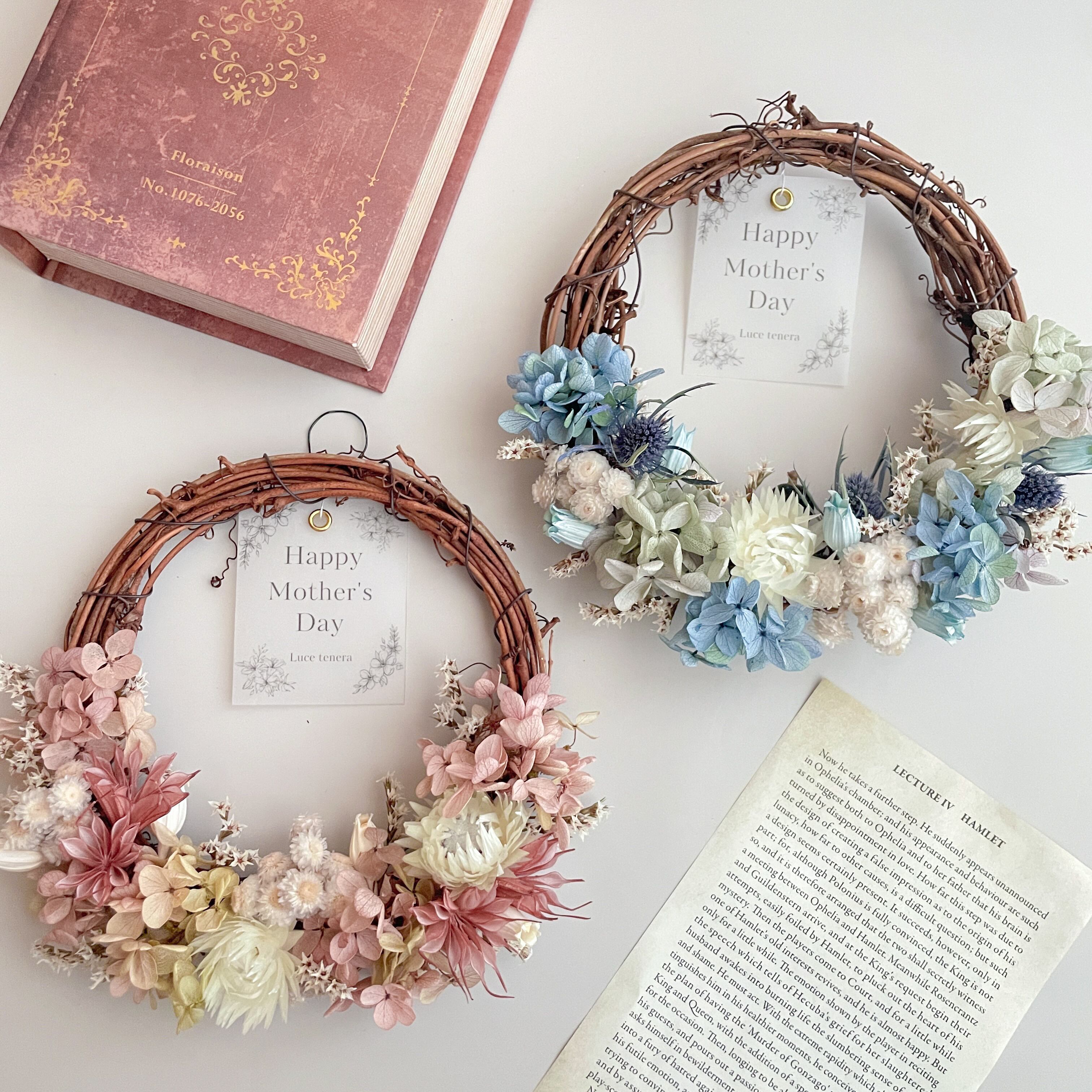 くすみカラーのドライフラワーリース(ピンク/ブルー)